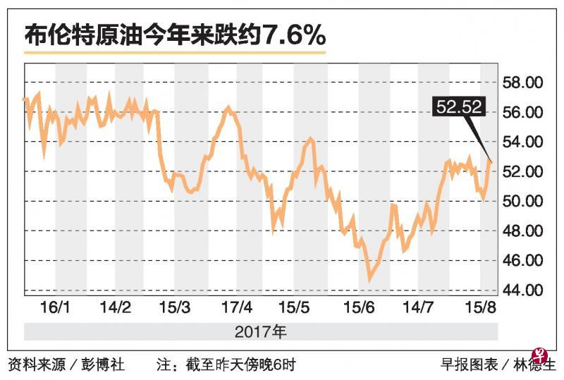 布伦特(Brent)原油期货价格昨早一度上涨至每桶53美元,达8月10日以来高位。美国WTI原油期货价格昨早也一度上扬至每桶48.75美元,为8月14日以来高位。到了昨天下午6时,两者价格已微跌至52.50美元和48.40美元左右的价格。