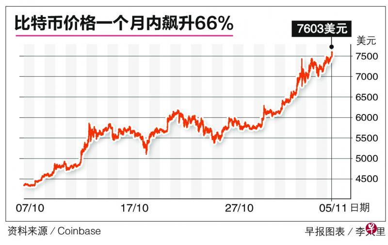 根据交易平台Coinbase的数据,比特币上月8日上扬至4500美元后节节高涨,四天内再涨至5000美元,到上周一(30日)已冲破6000美元。