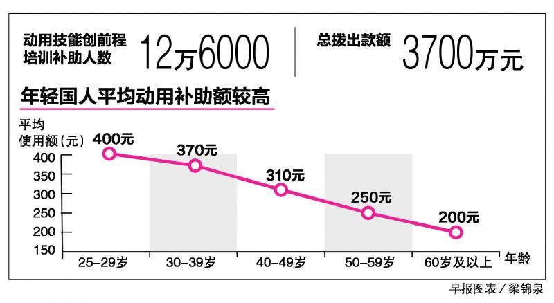 根据精深局提供的数据,使用培训补助的国人分布不同年龄层,年轻人平均动用较多补助。例如,介于25岁至29岁者动用最多,每人平均约400元。