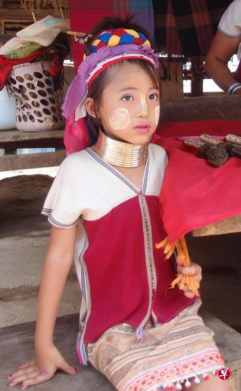 上午时分在村子里走了一圈,少有人影。长颈女大多集中在商店区作为村落门面,男人大概都已外出打工,小朋友们到处自由嬉戏。碰到的几个女童都没戴颈圈,在村子一角跳绳玩耍,与一般的村童无异。唯一戴着颈圈的小女孩,坐在商店里伴着同样戴着颈圈的妈妈,能讲几句英语,逐一为每一台相机摆款照相以后,不忘指着店面物品补上一句:buy from me please...