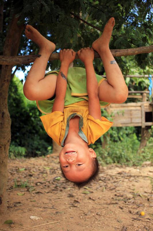 我们穿过茂密的丛林,跳过不知多少条小溪,攀了不知多少山坡,看见无数美丽的蝴蝶后,气喘呼呼地抵达苗族村落。村子的名字真是有趣,叫Ban Bo,即“无村”。村子小得很,放眼望去只见5间房子。孩子们荡着用藤和竹片制成的秋千。苗族孩子真可爱,眼睛眯眯的,他们轻而易举便可倒挂在树上,身上的泥土是最佳的防晒膏。