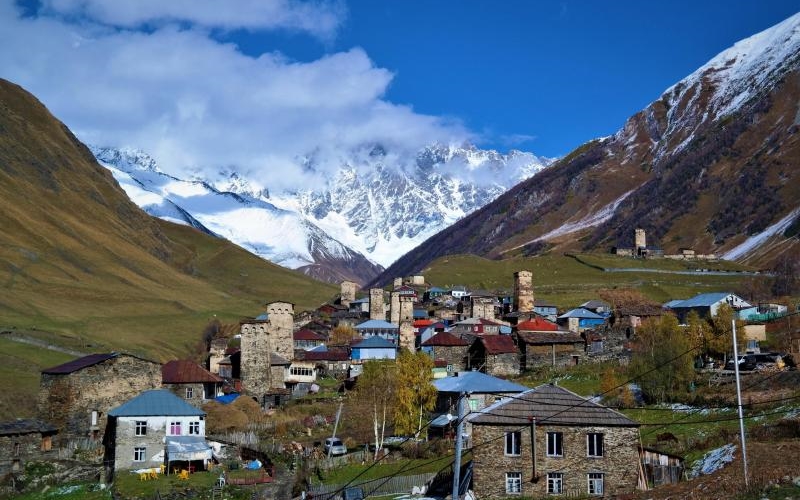 乌树故里(Ushguli)是我临时决定要去的。它位于高加索山脉,是欧洲人居住的最高处,高2200米。这个小镇一年有好几个月因积雪太多,无法通路,所以自古以来都没有太多人入侵,很多古老的建筑与古迹都得以完整保存,因此在1996年被列为世界文化遗产。