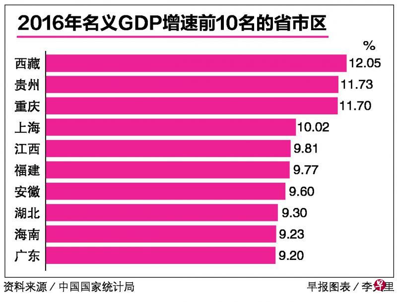 在名义增速方面,则呈现了南快北慢的趋势,西南地区的西藏、贵州和重庆均超过了11%,位列前三。