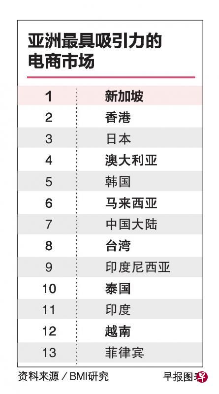 根据报告评估,本区域最具吸引力的前三大电商市场分别是新加坡、香港和日本。其中,新加坡和香港的优势是高度城市化、富裕人群多和物流网络发达,也被阿里巴巴和亚马逊(Amazon)等电商巨头视为向区域扩张的理想据点。