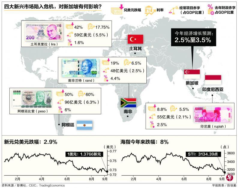 新兴市场危机蔓延,本地市场也被拖下水。新加坡海峡时报指数从年内高位跌落了14%,新元兑美元的汇率也从年内高位走软5%。