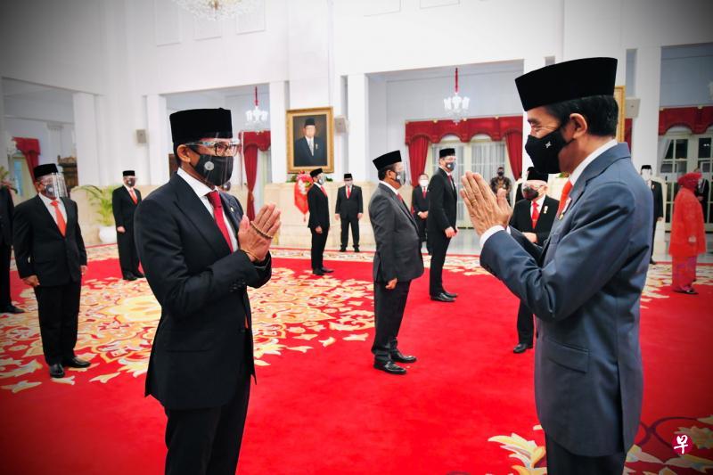 印度尼西亚总统佐科周二宣布改组内阁并撤换六名部长,同时引进企业家桑迪阿加等六人取代,他们昨天在总统府宣誓就职。印尼总统府发出的照片显示,桑迪阿加(Sandiaga Uno,左)宣誓就任旅游与创意经济部长后,佐科(右)向他祝贺。