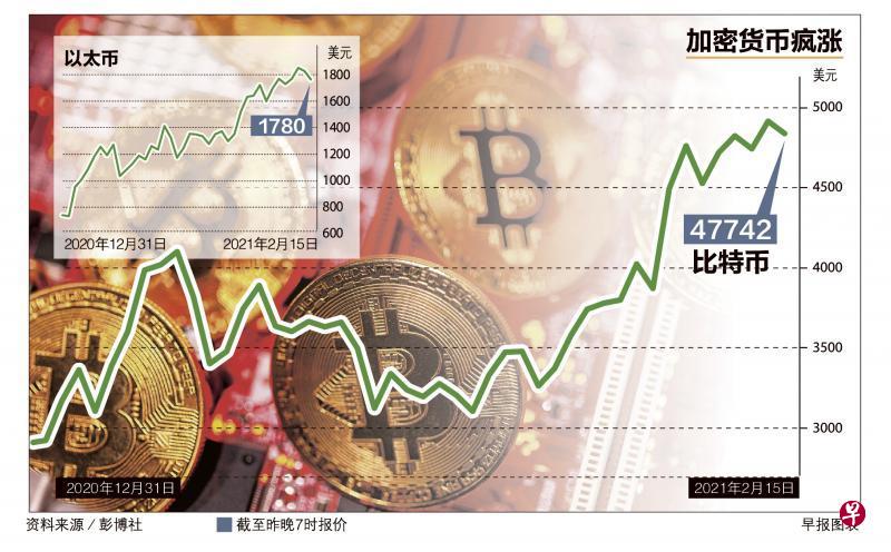 24小时不停计价的比特币在上星期天升至4万9612美元纪录高位,今年来已上涨逾60%;相较比特币这加密货币界龙头老大,市值第二大的以太币(ethereum)也升势强劲,上周五创下1851美元历史新高,今年来暴涨137%。