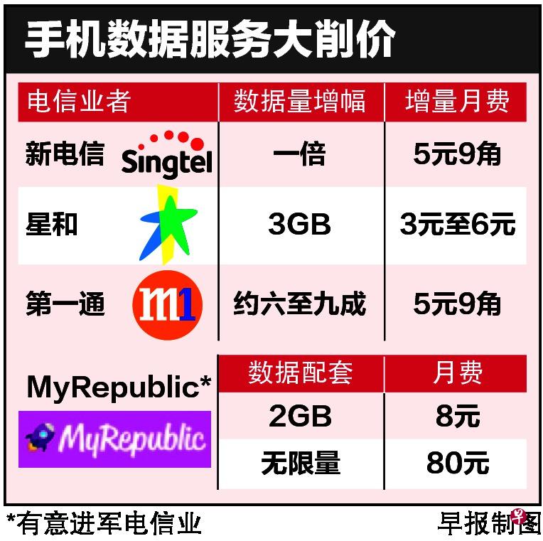 有意竞标成为本地第四家电信业者的互联网服务供应商MyRepublic,计划推出超低价移动数据配套,三家电信业者严阵以待,先后宣布移动数据服务大削价,因应MyRepublic可能带来的竞争。