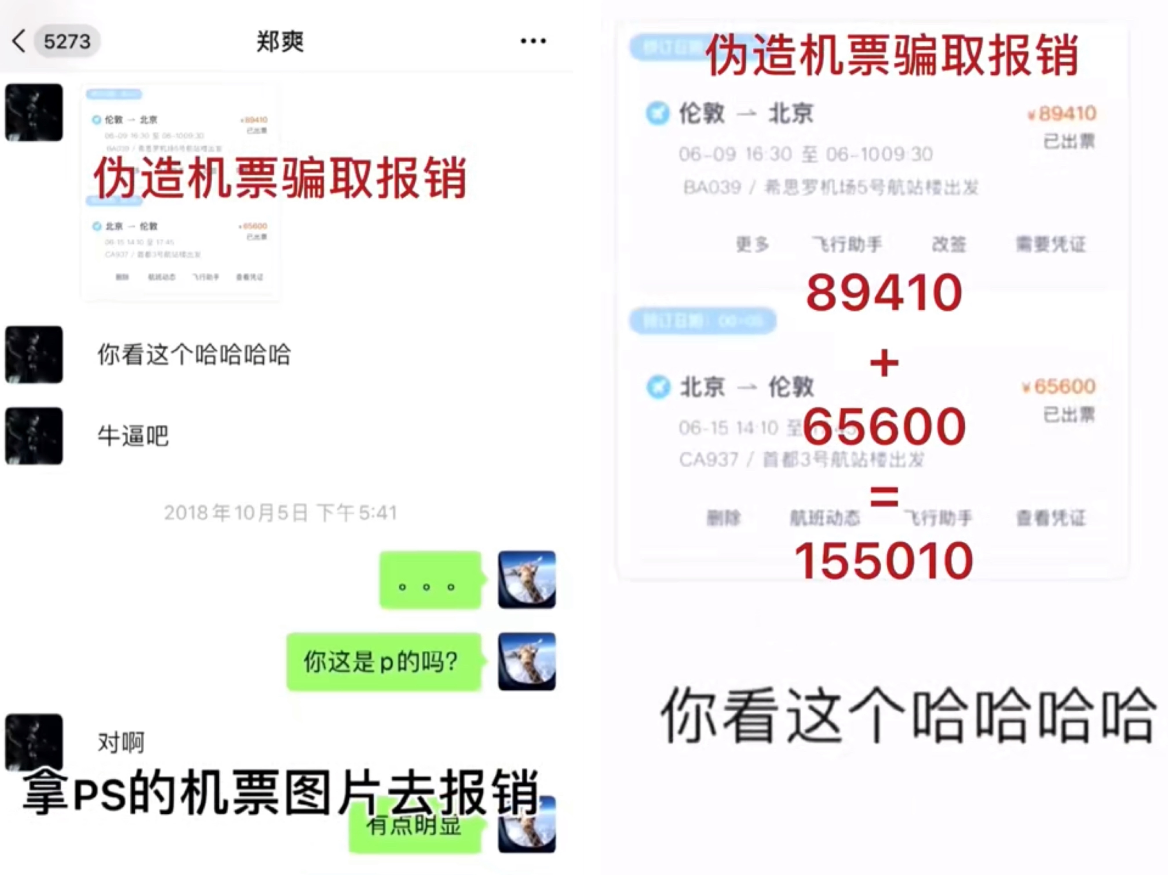 另外,张恒也爆出郑爽PS机票的图片,并指出郑爽用伪造的机票骗取报销费用,共计约15万5000元人民币。