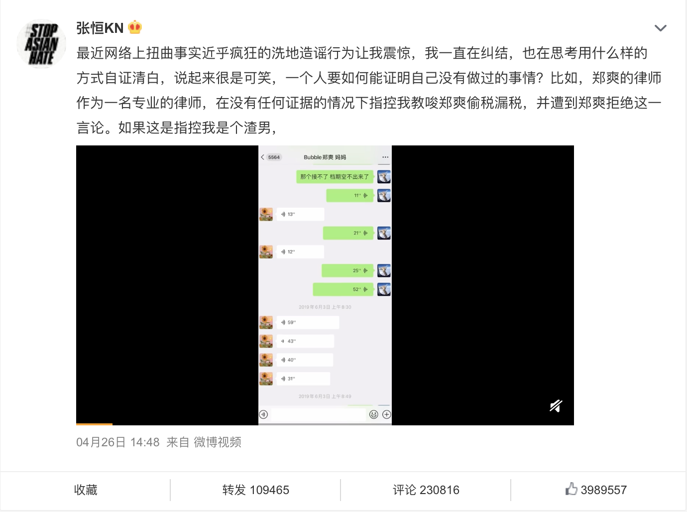 中国女星郑爽的前男友张恒前天(4月26日)曝光语音聊天记录,用视频方式呈现。仅仅约5分钟的视频,信息量巨大,揭露郑爽违法和违反道德规范的“三宗罪”。