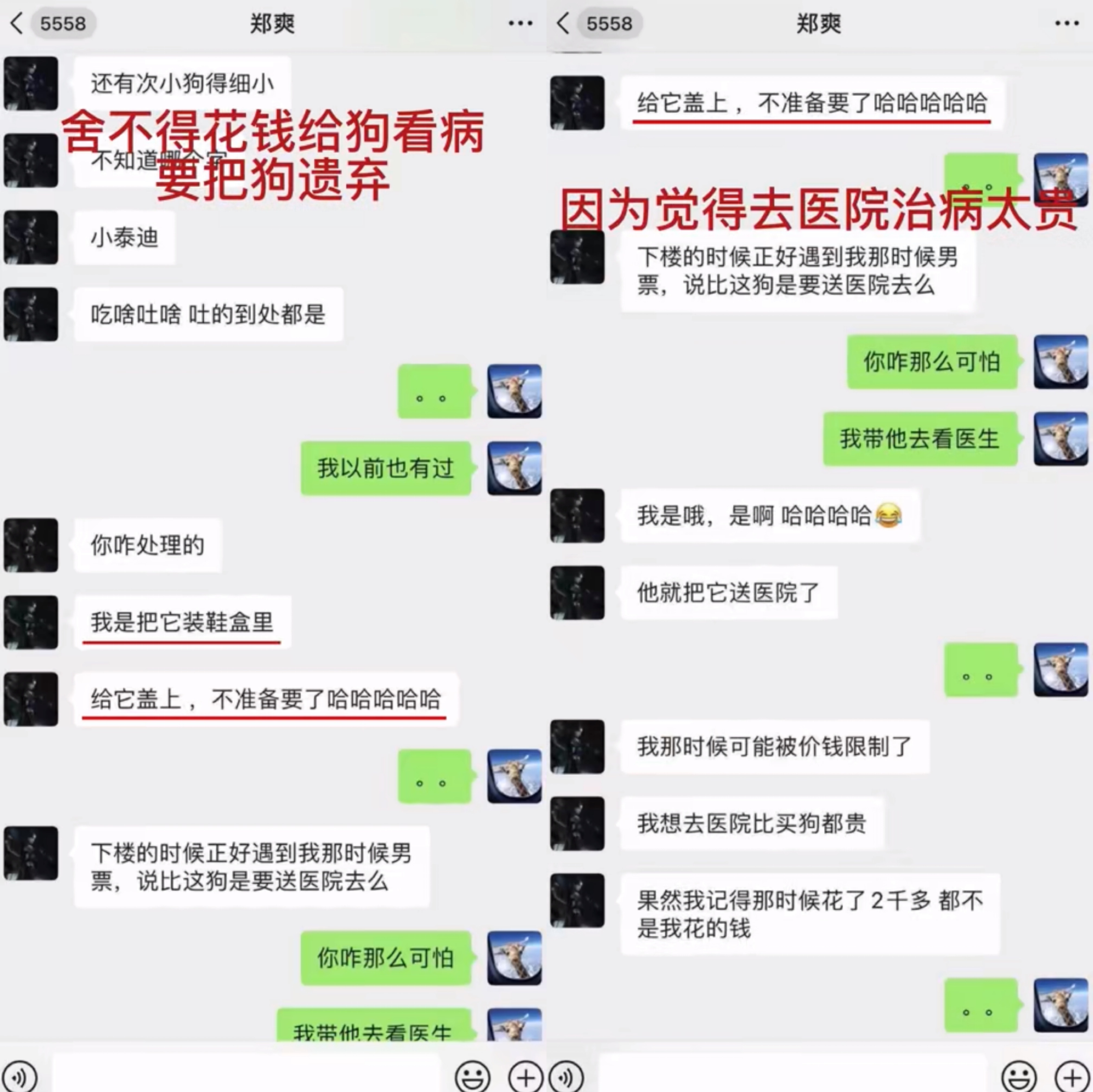 据张恒曝光的聊天记录,郑爽说,她养的宠物狗生病了,但因为看病的费用比买狗更贵,不舍得花钱给狗看病,于是要把狗放鞋盒里遗弃。