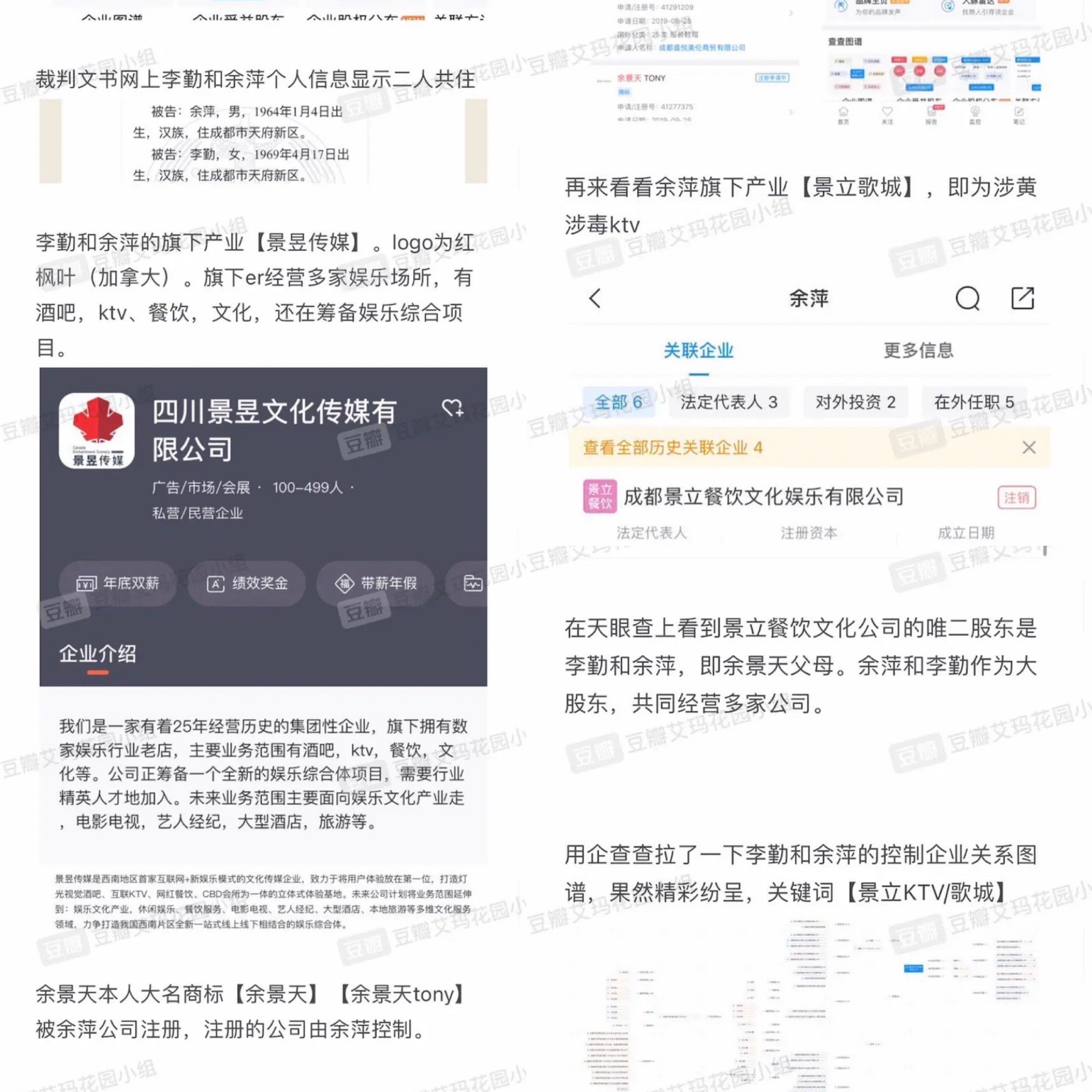 4月29日,有网友在社区网站豆瓣上爆料,余景天父母在中国四川成都开设的“景立娱乐歌城”非法经营,涉嫌卖淫,并容纳贩毒和吸毒人员。帖子当时获得几千条回复,不过,原帖目前已无踪迹,疑似被公关。