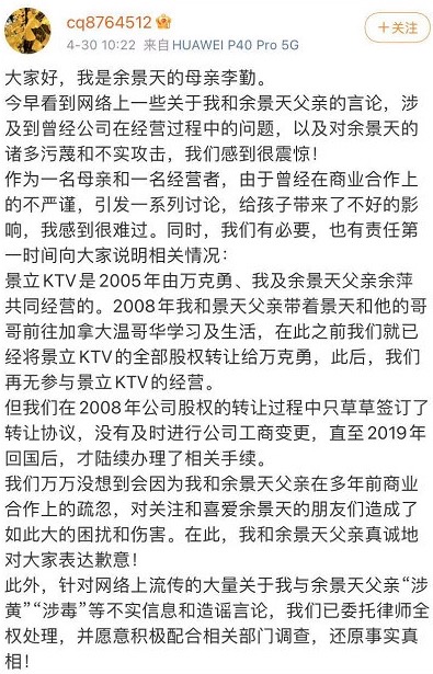 4月30日,余景天的母亲李勤在社交媒体上澄清说,“涉黄”“涉毒”是不实言论和造谣。她称,“景立娱乐歌城”是2005年由万克勇、余景天的父亲余萍和她共同创办,早在2008年,她和余萍已将KTV的全部股权转让给合伙人万克勇。李勤的声明完全撇清了余景天父母和涉黄、涉毒的关系。