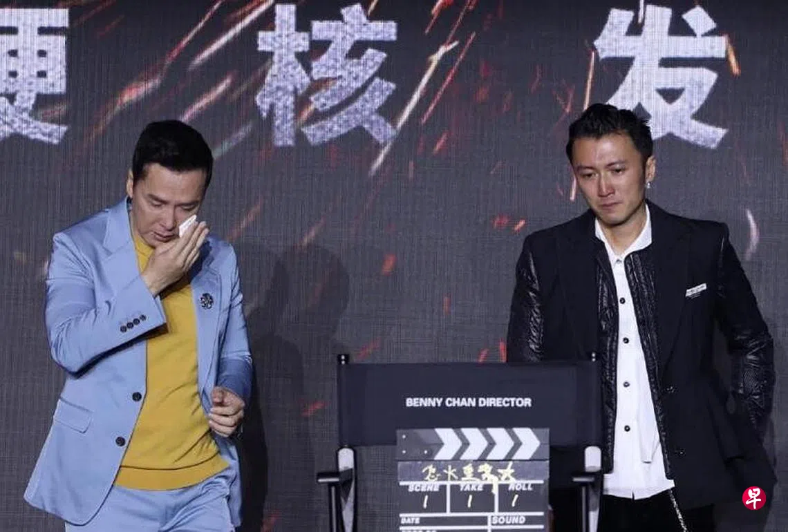 发布会最后,全体出席人员要一起拍摄合照,工作人员将陈木胜的导演椅搬上台,甄子丹和谢霆锋立刻按捺不住情绪,转身背对台下摄影机,偷偷低头擦拭眼泪。