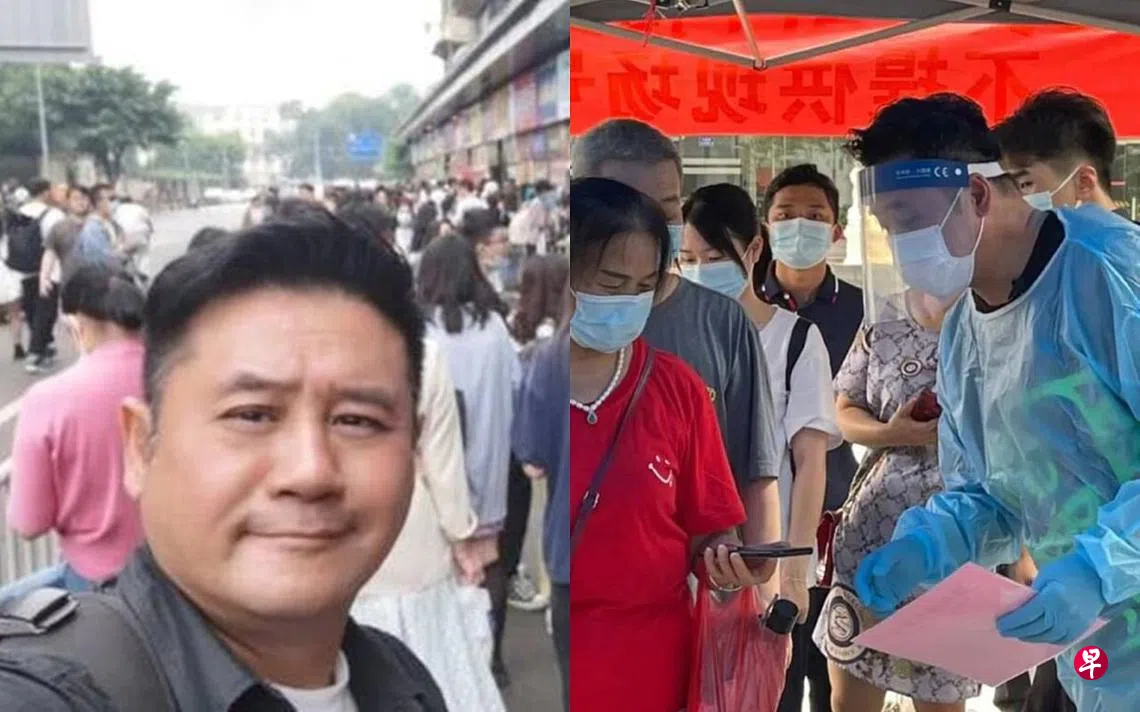 身穿整套防疫装束的麦包,在炎热天气下满头大汗地手持印上“健康通行登记”的纸张,为轮候接受检测的广州市民,检测手提电话登记编号及细心讲解指引服务。