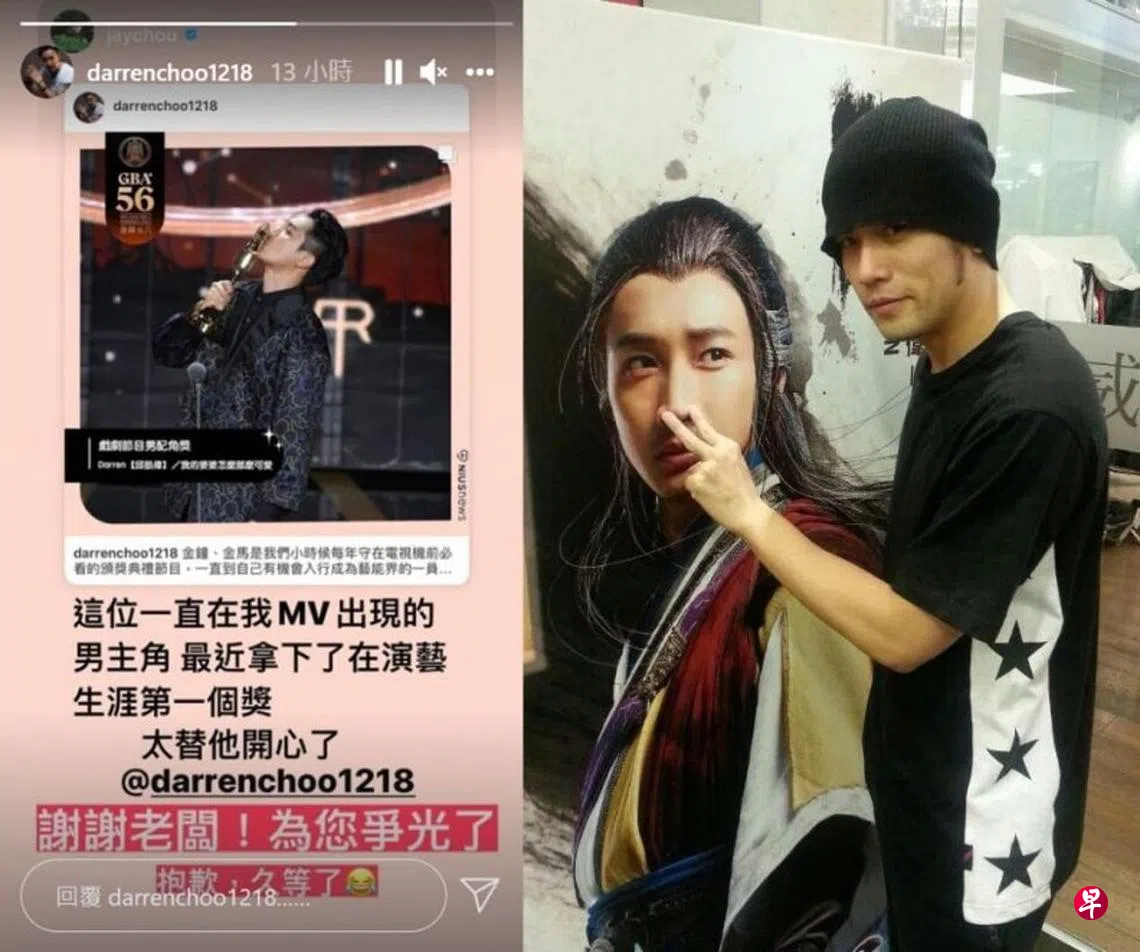(台湾讯)入行近18年的邱凯伟(Darren),演艺版图横跨综艺、音乐、戏剧,苦熬多年,这次终于以《我的婆婆怎么那么可爱》的苏秉忠一角拿下金钟奖戏剧类节目最佳男配角。他的努力,目前身在外国的老板周杰伦看在眼里,有感而发说:“这位一直在我MV出现的男主角,最近拿下演艺生涯的第一个奖,太替他开心了。”对此,邱凯伟转发回应:“谢谢老板!为您争光了。”还不忘幽默地说:“抱歉,久等了。”