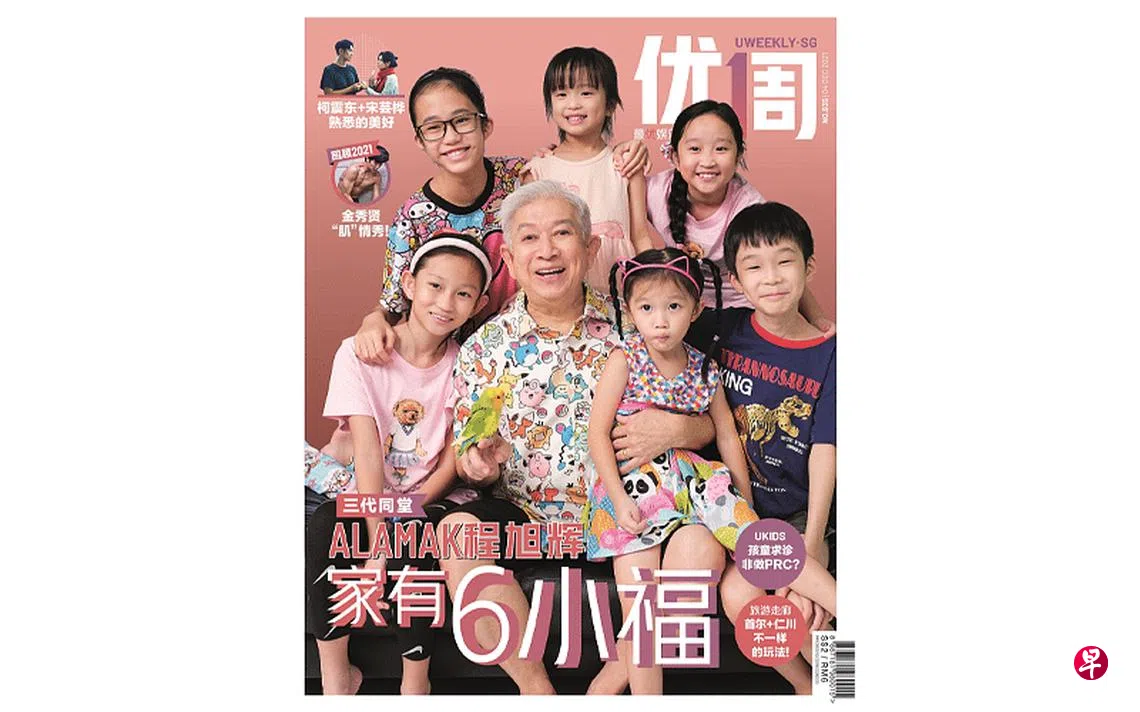 (本地讯)最新一期《优1周》的封面人物是本地搞笑艺人程旭辉(辉哥)和他的外孙们。今年69岁的辉哥有三个女儿、六个外孙(五女一男),三代同堂,其乐融融。