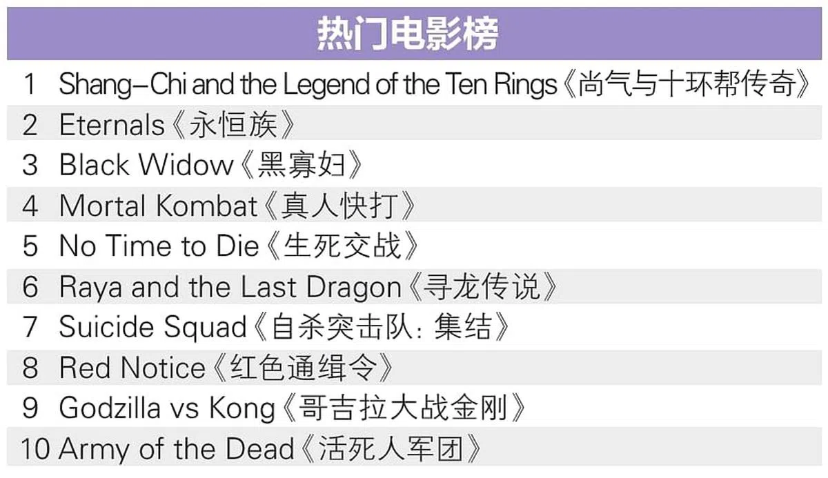 除了《尚气》,“热门电影榜”有好几部亚裔演员参与的电影,包括马东石和陈静演出的漫威电影“Eternals”(《永恒族》),本土姜黄经汉演出的好莱坞电影“Mortal Kombat”《真人快打》,真田广之有份演出的美国电影“Army of the Dead”(《活死人军团》)。