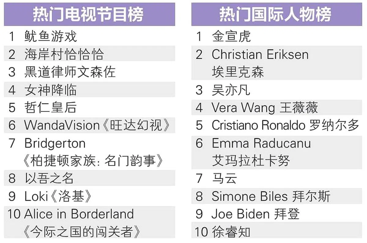 谷歌昨天公布新加坡年度搜索榜,风靡全球的韩剧《鱿鱼游戏》(Squid Game),在“热门电视节目榜”(Trending TV Shows)荣登榜首,并在“热门搜索榜”(Trending Searches)排名第5。值得注意的是,“热门搜索榜”的前四名都是体育项目,第6到第9名也是新闻相关项目,《鱿鱼游戏》突破重围,受欢迎程度可见一斑。