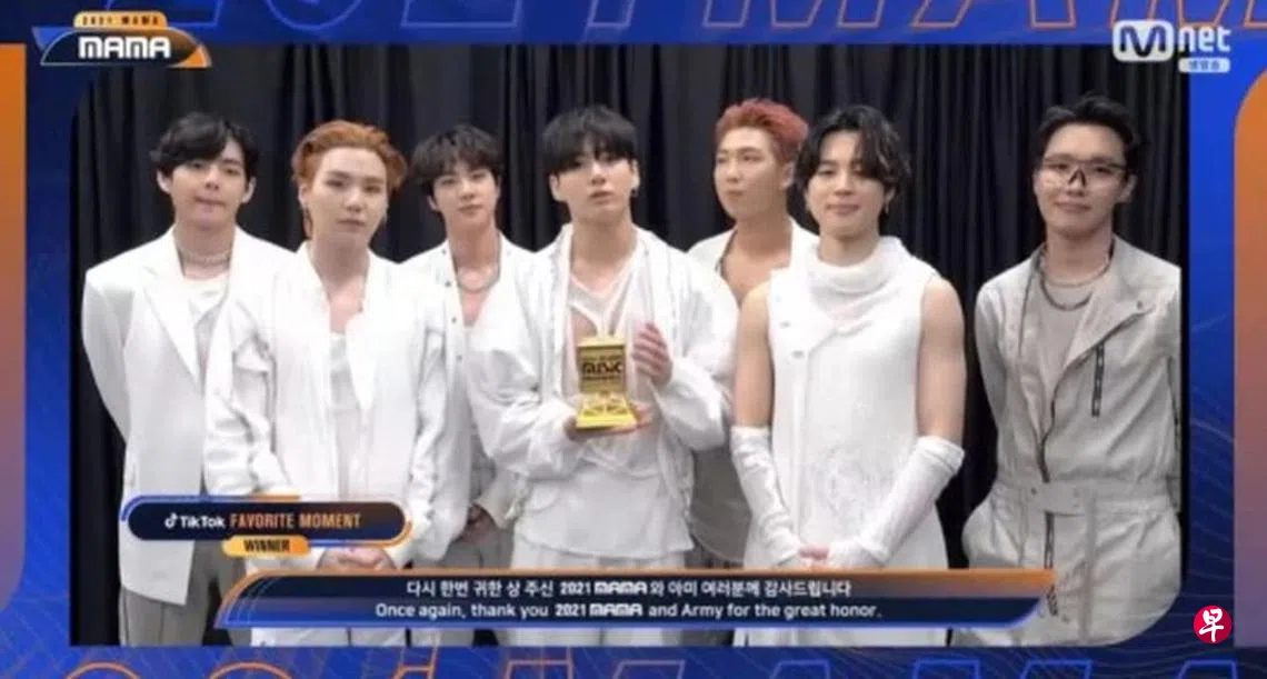 (首尔讯)韩国年度Mnet Asian Music Awards(MAMA)颁奖典礼前天举行,因隔离中而无法出席的BTS(防弹少年团),拿下年度艺人、年度专辑、年度歌曲、年度全球偶像四大奖,他们也夺得最佳男团、最佳男团舞蹈表演、Worldwide Fans' Choice与TikTok最受欢迎瞬间、最佳MV奖,至少包揽九个奖项,还不包含幕后团队的奖项。
