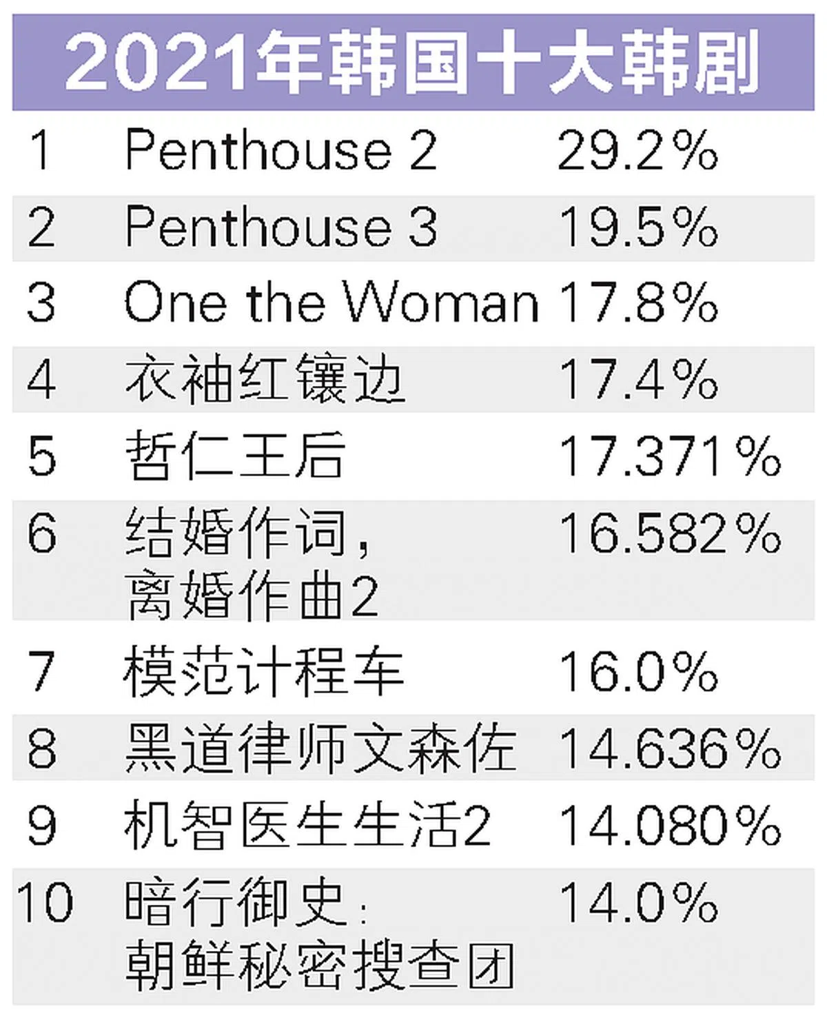 记者统计韩国去年十大韩剧,发现韩国与本地观众口味相近,多部作品包括“Penthouse”第二和第三季、“One the Woman”《结婚作词,离婚作曲2》《模范计程车》《黑道律师文森佐》《机智医生生活2》,都在两地深受欢迎。