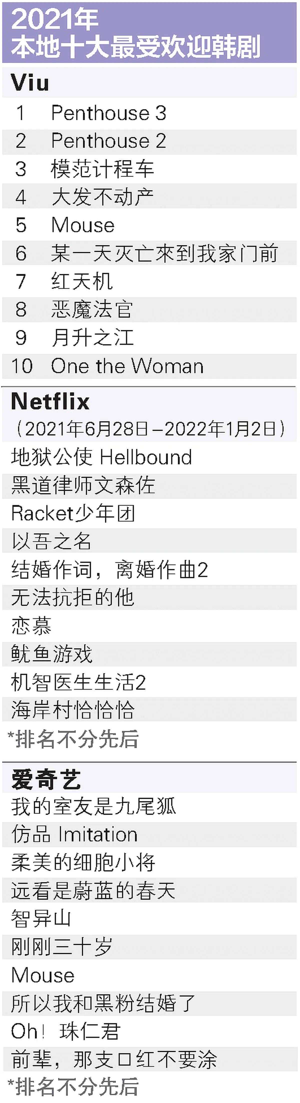 去年有哪些韩剧最受本地观众喜爱?《联合早报》记者综合解读三个串流平台Netflix、Viu和爱奇艺的2021年韩剧新加坡地区十大榜单。由于这三个平台的收视统计方式不同,Netflix和爱奇艺也不为十大剧集排名,加上一些剧集只在某个平台独家播出,各平台也有自家原创内容,所以无法明确知道哪部剧最受欢迎。但对比这三个榜单,记者发现与前一年相比,爱情剧不再是本地观众的最爱,而是狗血、复仇、疗愈这三大剧种更受落。