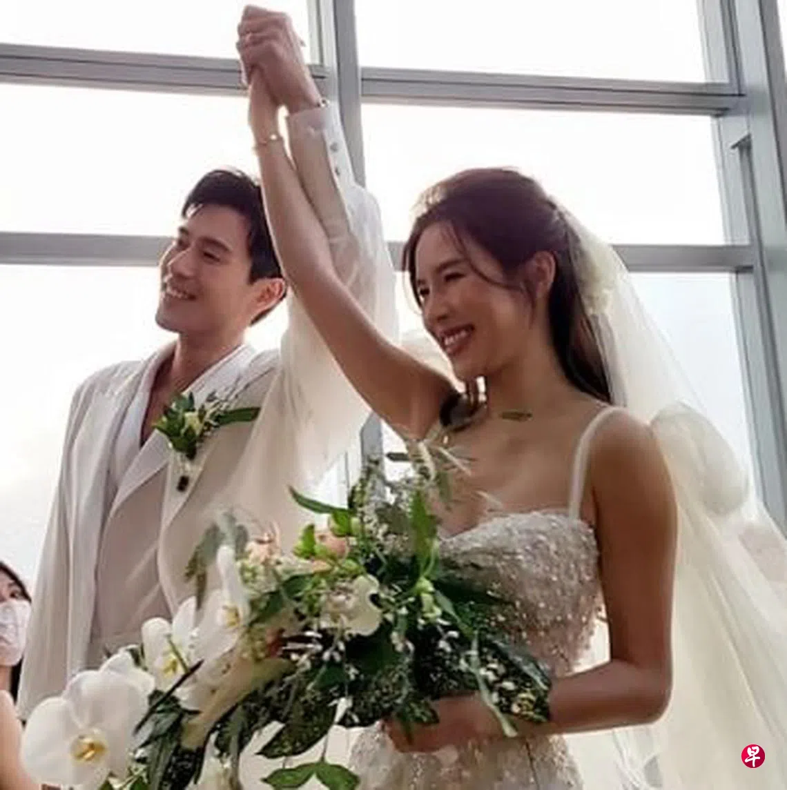 谢俊峰和曾敏在Instagram限时动态分享婚礼画面,一对新人穿着白色西装和礼服,在以花卉为主题的布置前正式结为夫妻,幸福全写在脸上。谢俊峰还在婚宴上为娇妻现场演唱情歌,很是浪漫。