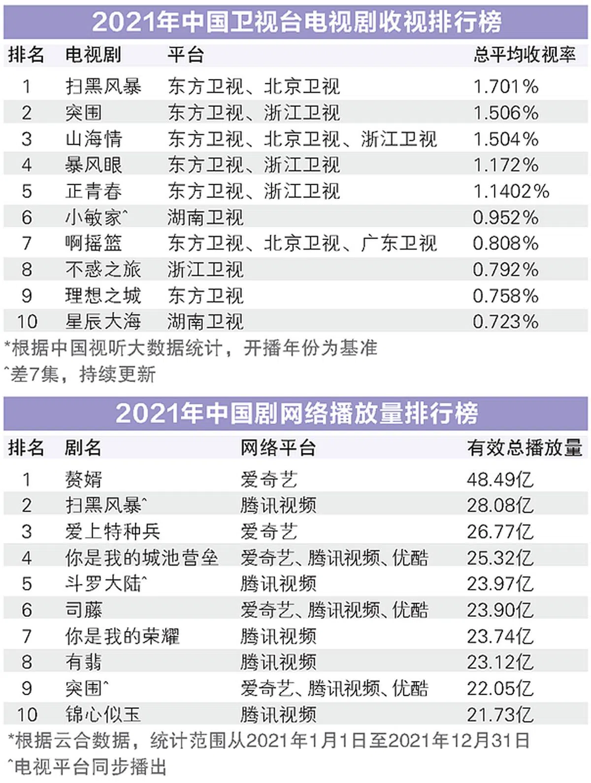2021年中国卫视台电视剧收视率、网络播放量两大排行榜出炉,电视剧收视率十大中不见古装剧,网络播放量排行榜则是流量小生花旦的天下。