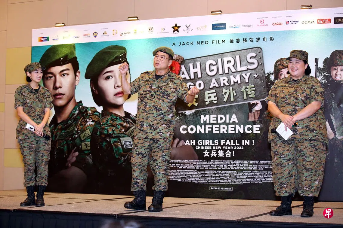 本地导演梁志强凭《新兵正传》系列掀事业高峰,虎年贺岁档将推出《女兵外传》(Ah Girls Go Army),影片今天(1月28日)举行记者会,以军人打扮的梁志强透露:“Ah Girls比Ah Boys难拍。”