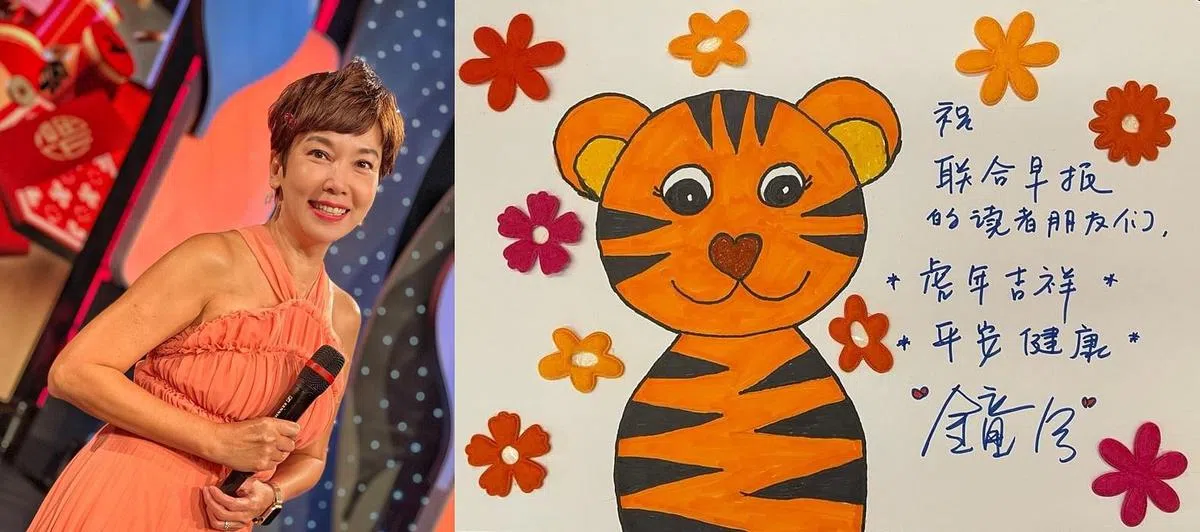 综艺阿姐钟琴的童趣画作让人眼前一亮。她为《联合早报》读者画了一只可爱的友善虎,小虎笑眯眯的,鼻子还是心形的呢,配上朵朵花儿,颇有春意。钟琴祝愿本报读者:“虎年吉祥,平安健康。”