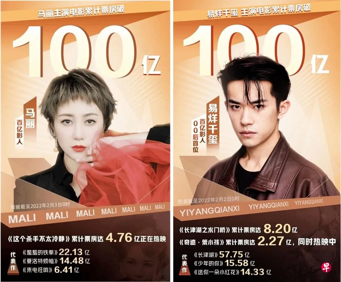 易烊千玺则是首位电影票房过百亿的00后影人。据灯塔专业版数据显示,截至2022年2月2日零时,易烊千玺主演电影票房破百亿人民币。易烊千玺迄今为止的主要电影作品包括《少年的你》《送你一朵小红花》《长津湖》《奇迹·笨小孩》《长津湖之水门桥》,除了目前放映中的《长津湖之水门桥》,《长津湖》票房达57.75亿(约12.25亿新元),《少年的你》票房15.58亿(约3.3亿新元),《送你一朵小红花》票房14.33亿(约3.04亿新元)。