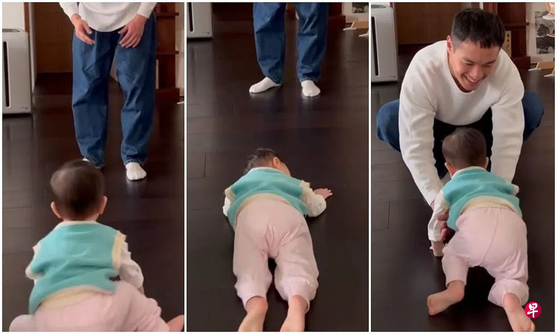 视频中的画面,只见1岁多的女儿还在学走路,走没两步就蹲下身子,然后俯躺在地上。杨祐宁用处理过的“娃娃音”温柔地跟女儿喊话:“怎么样,爹地好帅,昏倒!昏倒!对了,爹地好帅所以昏倒对不对,好棒喔!”说完,女儿又爬起身了。