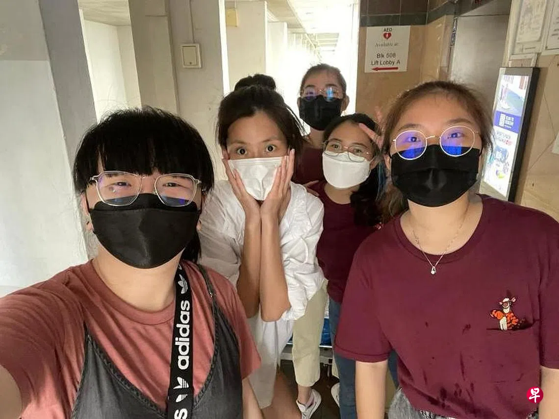 五位年轻女生穿梭在组屋区为120位独居老人派送内有生活用品的礼包。