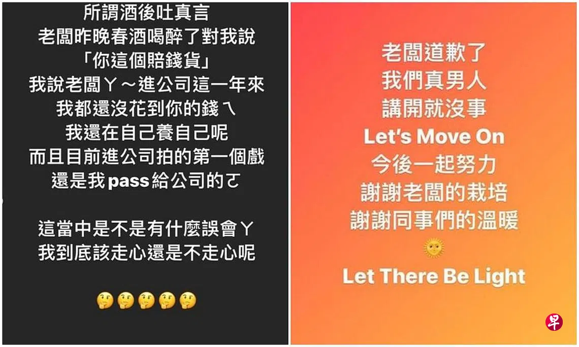 没想到一天后神反转,李沛旭又在社媒发文:“老板道歉了,我们真男人,讲开就没事……今后一起努力,谢谢老板的栽培,谢谢同事们的温暖。”显然已大方接受老板道歉,放下不满,至于旧帖也已删除。