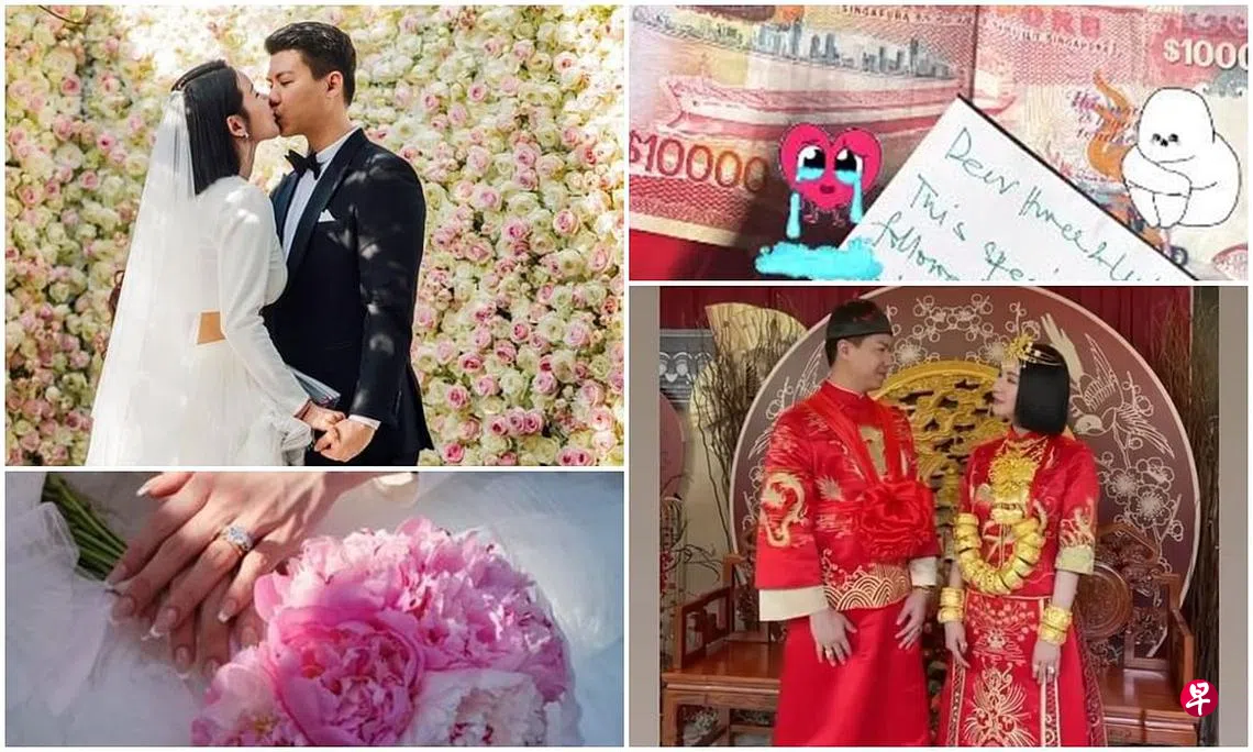 林慧俐和新郎的礼服分中西两种。林慧俐穿上西式白色婚纱,中间露肚皮,典雅中透着性感;新郎新娘就地坐着合照,地面全被锦簇花团覆盖,背面则是巨型花墙。中式部分,一对新人全身红彤彤,男方是长袍马褂,女方则是中长袖的长裙,上面印有花纹图案,双手各戴2个金环,胸前吊着14个金环,加上从头冠到项链上的金饰,只能用金光闪闪形容。