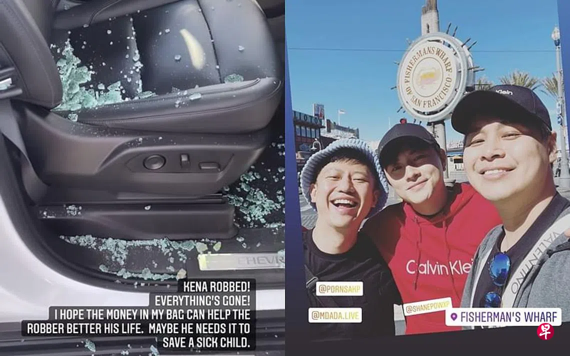 Pornsak、包勋评和江承熹上个月初到美国直播卖货,在当地逗留一个多月。三人本地时间昨早(9日)于IG晒出在旧金山游玩的照片,到了早上10时许,包勋评在限时动态发了一段视频。从视频中可见,车窗被打碎,玻璃散落车子内外。他留言说,手机、护照、钱包和贵重物品都被劫走了。