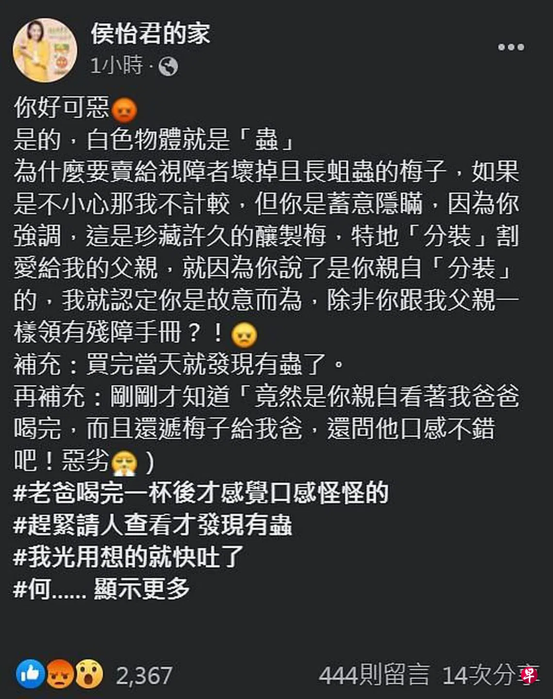 侯怡君也在面簿补充“买完当天就发现有虫了”,更可恶的是,她之后得知卖家是眼睁睁看着侯爸喝了梅汁再递上梅子,还问了句“口感不错吧”?事后是因侯爸感觉口感怪怪,另请他人查看才知自己误吞虫子。侯怡君之后又补上:“大家认识这么久了,为什么要欺负老人家且是视障人士?”看得出完全气炸了。