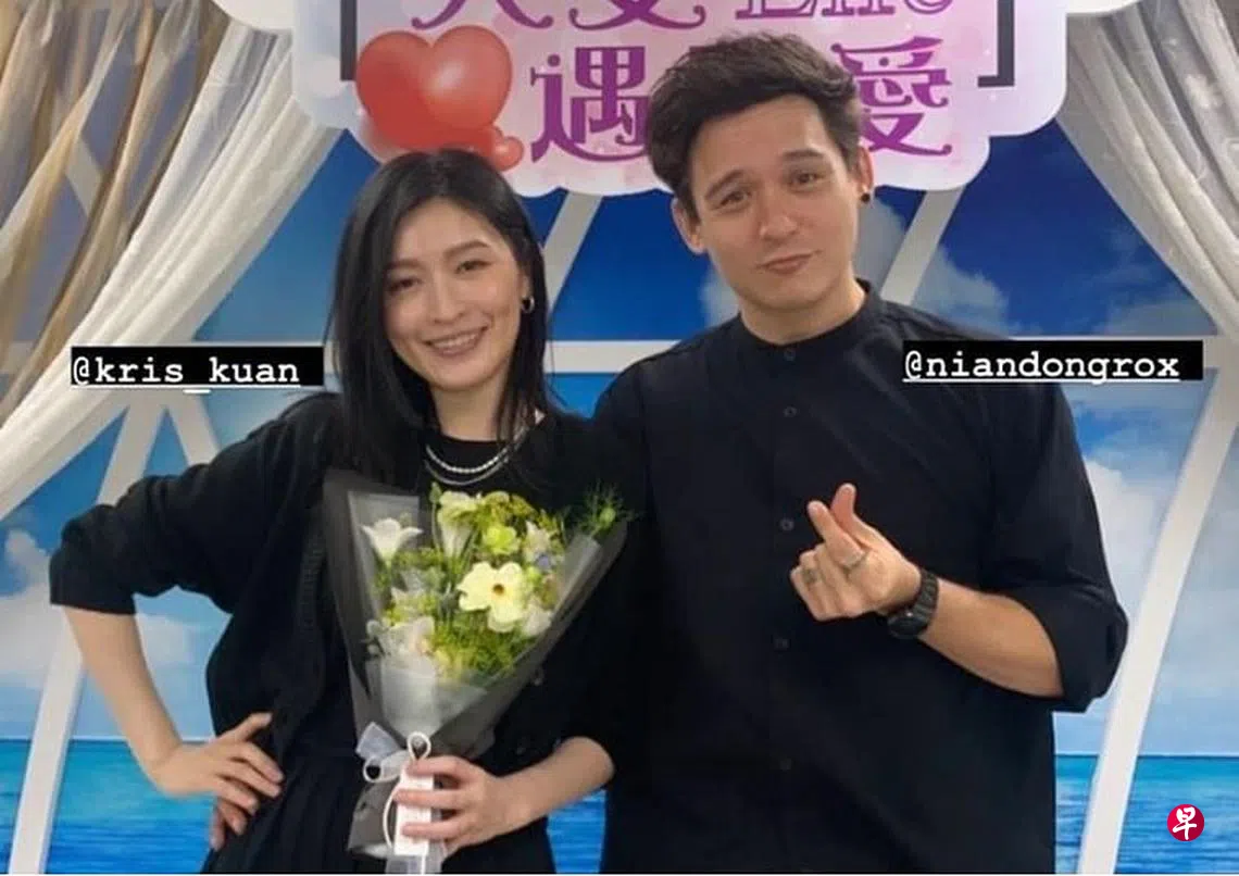 照片中两人穿着黑色情侣装,管馨手上捧着一束花,倪安东则比出手指爱心。另一段影片中,管馨和倪安东坐在柜台前办理结婚登记,身后则有一群朋友见证两人修成正果。