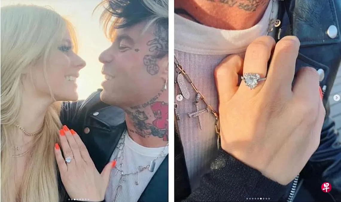 (综合讯)37岁加拿大人气歌手Avril Lavigne上周一才穿着订制Moi Moi Paris深V领口蓬裙礼服出席格莱美奖,红毯上还和小两岁歌手男友Mod Sun亲亲放闪,今天就在IG宣布订婚。男友在法国巴黎铁塔前单膝下跪求婚,Avril Lavigne开心用法语写道:“我愿意!我永远爱你。”还大秀超级大鸽子蛋钻戒。