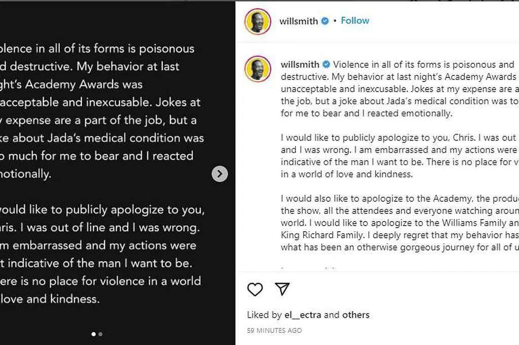 美国影艺学院院长David Rubin和执行长Dawn Hudson昨天发表联合声明:“董事会已决定,自2022年4月8日起算的10年内,Smith先生不得亲自或以视讯方式参加任何影艺学院的活动,包含且不限于奥斯卡颁奖典礼。”声明说,奥斯卡颁奖典礼旨在欢庆过去一年内影艺从业人员的功苦,但那些时刻“被Smith在台上展示不可接受的有害行为所掩盖了”美国影艺学院表示,他们没有做好准备,及时解决这些状况,对此感到非常抱歉。