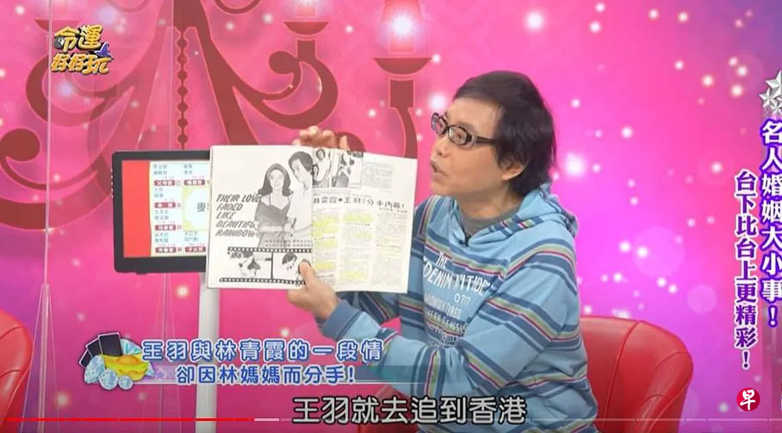资深媒体人麦若愚近日就在节目《命运好好玩》中提到这一段情,据传是林青霞打电话倒追,不过王羽认为自己的负面形象恐会影响女方,才紧急切断半年情。但麦若愚在节目中说,林青霞去香港出外景时,王羽一路从台湾追到香港再到菲律宾,还租名车载林青霞游车河,“那个时候她也沉浸在王羽的追求当中”。