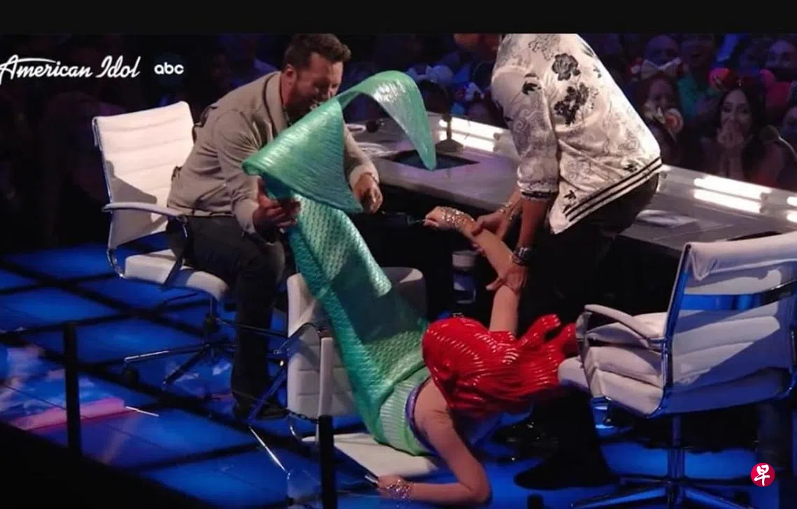 (洛杉矶讯)美国天后Katy Perry(凯蒂佩里)最近为第20季真人秀《美国偶像》(American Idol)当评审,为了10强比赛的“迪士尼之夜”化身美人鱼。由于穿上美人鱼装后行动不便,她出场时由另两名评审Lionel Richie(莱昂纳尔里奇)及Luke Bryan(路克布莱恩)以手推车推出场,后来当她打算跳到评判席时,没料椅子突然往后翻,让她跌坐地上,两名男评审几经辛苦才将她扶起,她再慢慢跳起移至座位,场面逗趣。