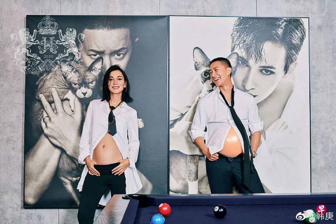 38岁的中国男星韩庚在微博晒出与妻子顶着“大肚子”的照片,写道:“我们‘怀孕’了!”,并标记了妻子卢靖姗。而卢靖姗也上传了一样的照片写道:“我们晋级了”,同样标记了丈夫韩庚。