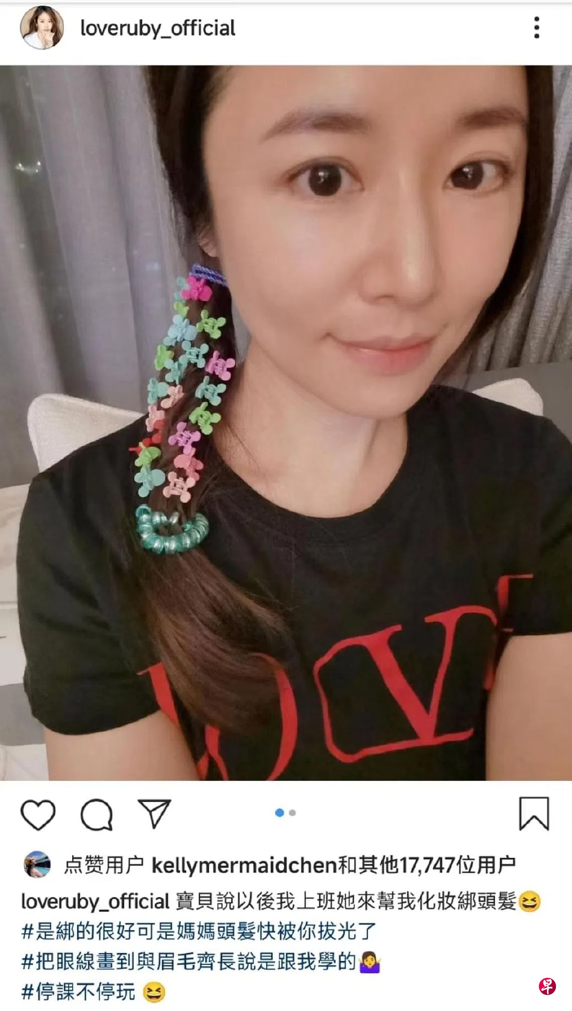 “宝贝说以后我上班,她来帮我化妆绑头发。绑得很好,可是妈妈的头发快被拔光了。把眼线画到与眉毛齐长,说是跟我学。停课不停玩。”——林心如(左图)在社媒晒5岁女儿绑的头发并配文。