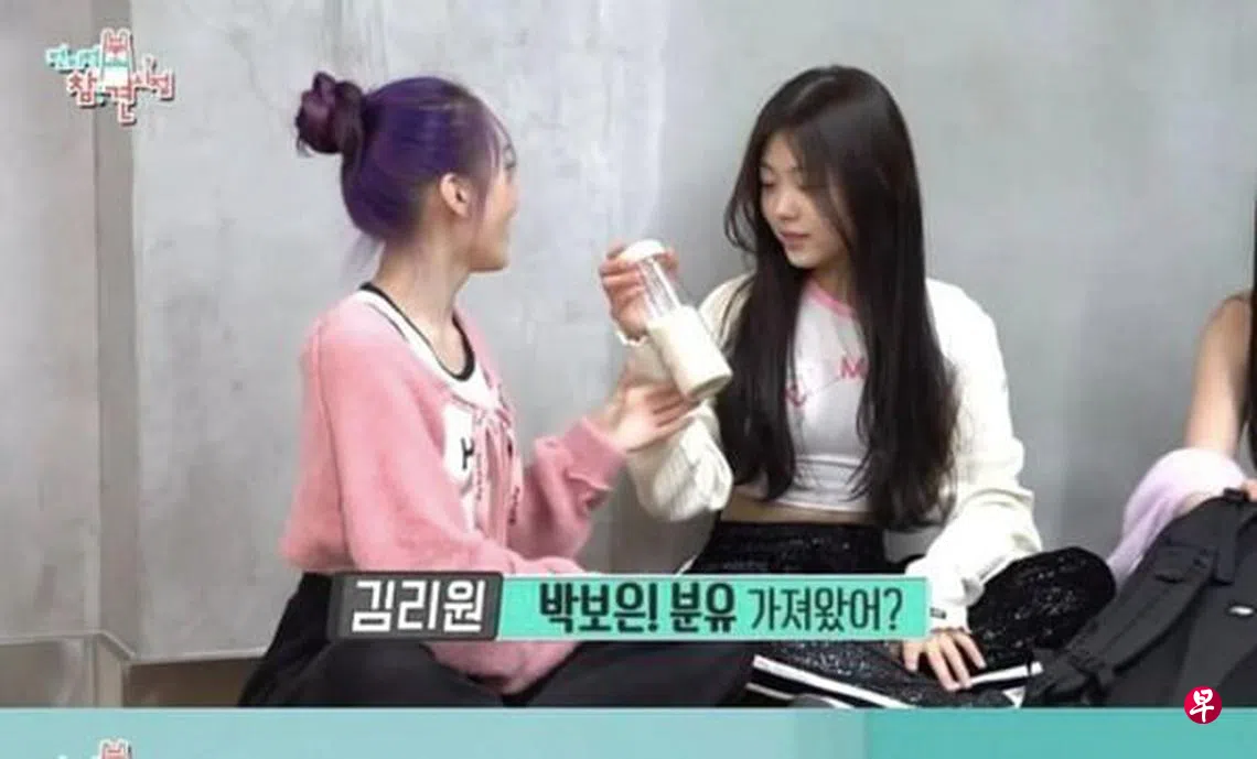 成员们在节目中透露,公司为了控制她们的体重而准备减脂饭盒,其中一幕只见14岁成员朴甫檼(Park Boeun)从包包里拿出一瓶冲泡好的奶粉喝了起来,其余成员则说:“队内有不少成员还在成长期,听说喝婴儿奶粉可以长高。”