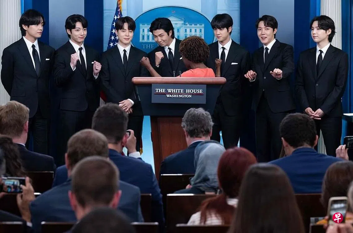 (华盛顿讯)韩国天团“防弹少年团”(BTS)继到联合国总部演讲之后,5月31日受邀与美国总统拜登会面,还在白宫例行记者会演讲,宣扬反仇恨亚洲犯罪,包容亚洲等议题。七人分别以韩英语演说,带动YouTube直播涌入30万人次抢看,白宫记者室49个座位被媒体挤爆,逾百人站在走道采访,BTS讲完下台,记者还以韩语高喊“BTS Fighting”,足见七子的高人气。