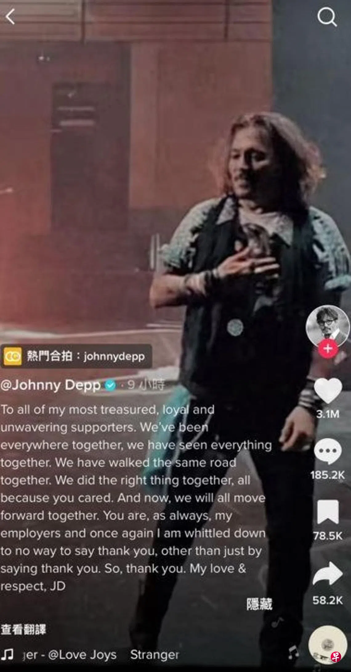 德普上传第一个视频,约15秒的内容集结了他前阵子出庭,飞到英国参加好友Jeff Beck(杰夫贝克)演唱会时,上台表演的画面及花絮。他感性写道:“致我所有最珍贵、最忠诚、最坚定的支持者,我们一起去过许多地方,我们一起经历一切,我们一起走过同一条路,我们一起做了正确的事,都是因为你的关心。现在,我们都将一起前进,你们一如既往地是我的支持者,我除了说谢谢之外,没有别的方式表达我的感谢。”