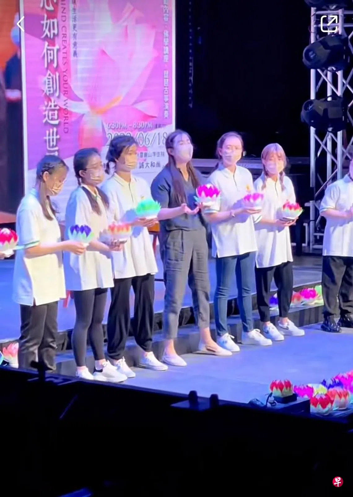 王祖贤在台上唱歌,随着音乐轻轻摇摆身体,还捧起莲花灯,画面恬静美好。从视频中还能发现,她身旁的一些参加法会的信徒不时地会转头偷看她,也有当天与会的人指出,王祖贤很平易近人,活动结束还一起收拾现场。
