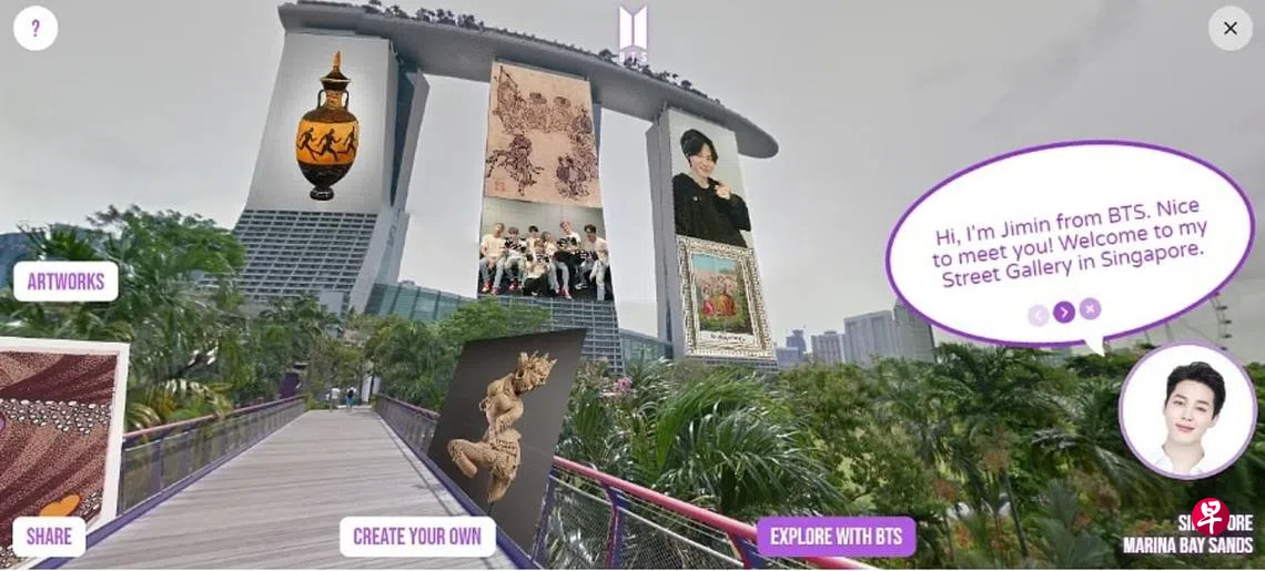 (综合讯)韩国天团BTS(防弹少年团)与Google(谷歌)艺术与文化平台携手合作,推出新的街景实验“BTS x 街头画廊”,替BTS的粉丝俱乐部“ARMY”庆生。 其中,成员智旻(Jimin)选择了新加坡的滨海湾金沙作为他的“街头画廊”。