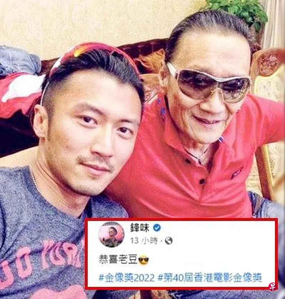 谢贤从影70年,当晚以电影《杀出个黄昏》夺下首座香港金像奖影帝宝座,创下新纪录,成为年纪最大的影帝,还和儿子谢霆锋相差10届同为影帝。谢霆锋当年拿下金像奖最佳新人时,曾呛老爸拍了几百部电影都没拿过金像奖,如今谢贤称帝,谢霆锋因工作留在北京没有出席,只在“锋味”面簿专页贴父子合照,送上4字祝福“恭喜老窦(老爸)”。网民指谢贤有嘴歪情况,健康看起来比去年差了很多,纷纷留言指责谢霆锋“为什么不出席支持一下爸爸”“亲生儿子不如林家栋”等,认为扶谢贤上台的人应该是谢霆锋。